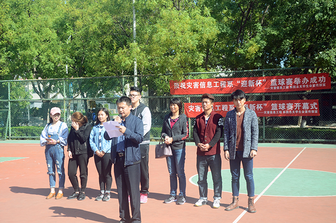 伴着淅淅沥沥的秋雨,十一黄金周悄然结束。10月8日中午,灾害信息工程系”迎新杯”篮球赛开幕式在南校篮球场召开。出席本次开幕式的有灾害信息工程系团总支书记欧阳群波、辅导员纪同娟老师、系学生会全体成员以及全体参赛运动员们。