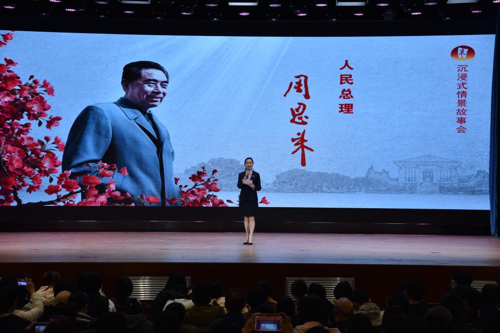 10时在学校礼堂举办《人民总理周恩来》沉浸式情景故事会。本次故事会由周恩来纪念馆“海棠花”党支部讲解员倾情演绎。演员们通过情景讲述、微纪录片、散文诗朗诵、演唱等方式,将《我认的主义一定是不变了》《危局中的擎炬者——周恩来与西安事变和平解决》《西花厅不灭的灯光》《最美的情书》等八个故事再现出来。生动的演绎让在场师生仿佛穿越时空,真切感受到周恩来理想信念的确立、危机中斡旋、中华人民共和国成立后心系人民以及与邓颖超的革命爱情故事,深刻理解了红色家风的精神内核。
